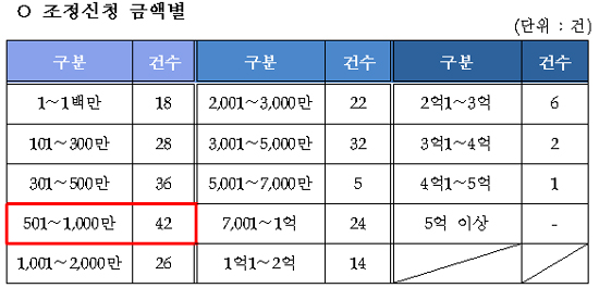 조정신청 금액은 대부분 5000만원을 넘지 않았지만 4억원대 고액 신청건도 일부 포함됐다.