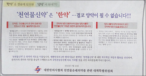 의사들의 천연물신약 처방에 반발, 1인 시위 뿐 아니라 성명서 및 광고 등을 통해 천연물신약의 한의사 처방 및 활용을 주장하고 있는 상태다.