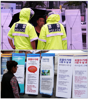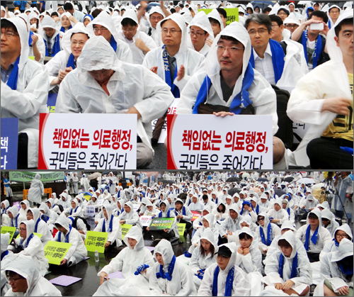 흰 우비와 파란 수건을 든 의사들은 서울역을 드나드는 시민들이 그들의 목소리를 주의깊게 들을 수 있을 정도로 '환자위한 최선진료 국가가 보장하라'는 구호를 외쳤다.