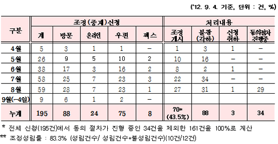 중재 결정된 12건 가운데서는 10건이 당사자들이 중재안을 받아들여 조정이 성립됐다. 시행초기이지만 조정성립률은 83.3%로 매우 높은 수준으로 평가됐다.