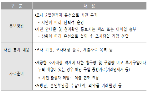 먼저 조사대상 약국에 조사 2일전까지 유선으로 사전 통지된다. 사전 안내문 및 현지확인 통보서는 팩스 또는 이메일로 송부된다.