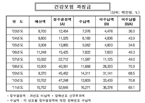 미수납률은 작년 뿐 아니라 2008년 70.9%, 2009년 68.5%, 2010년 70.8%로 최근 4년간 약 70% 수준을 유지해왔다.