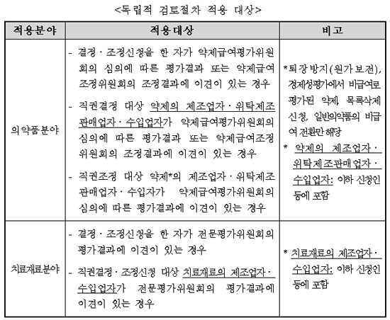 ◆독립적 검토신청 대상= 약제 및 치료재료의 평가 또는 일부 조정결과가 대상이다. 의약품은 급평위 평가결과, 급여조정위 조정결과에 이견이 있는 경우 제조업자, 위탁제조판매업자, 수입업자가 검토 신청할 수 있다.
