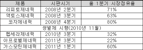 액토스 제네릭군도 1분기 80%에 달하는 시장점유율을 기록해 여전히 강세를 보이고 있는 것으로 관측된다.