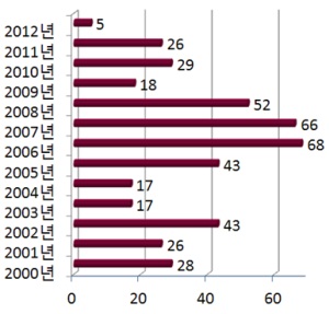 국내사가 진행한 항암제 임상도 2009년 13건, 2010년 18건, 2011년 18건 등 총 49건으로 증가추세에 있다.