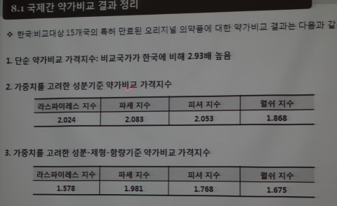 가중치를 고려한 성분-제형-함량을 기준으로 한 약가 비교 결과는 외국 약가 수준이 한국에 비해 1.58~1.98배 수준으로 한국이 외국에 비해 약 68% 가량 저렴하다는 것이 증명됐다.