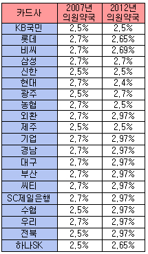 지금은 카드사별로 의원과 약국 2.5~2.97%, 종합병원 1.5% 등으로 업종에 따라 수수료율을 동일하게 적용했다.