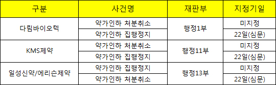 일성신약 등 제약사 4곳이 제기한 약가인하 효력정지 '심문기일'이 다음주로 지정됐다.