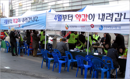 이날 11시부터 보건복지부, 국민건강보험공단, 건강보험심사평가원 직원 30여명은 청계광장에 부스를 차리고 4월 약가인하를 시민들에게 홍보했다.