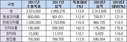 원료의약품은 9억101만불 어치를 수출했다. 이 역시 전년 7억3951만불보다 21.8% 늘어난 액수로, 목표액(8만불)을 상회했다.