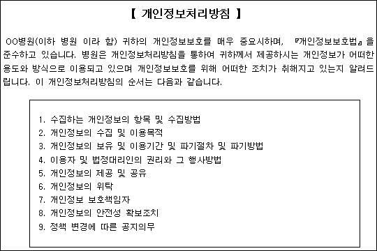 홈페이지를 운영하는 병원은 처리방침을 홈페이지에 게시할 경우, 과태료는 피할 수 있지만 진료카드를 작성하는 환자를 위해 처리방침을 별도로 인쇄해 접수 창구에 비치하는게 좋다.