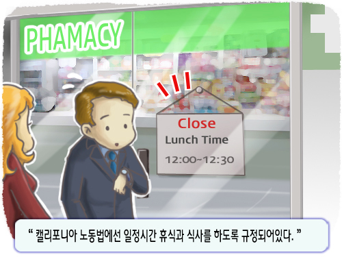 평일에는 2명의 약사가 근무하기 때문에 점심시간이라고 해서 약사가 약국을 비울 일은 없다. 하지만 주말에는 약사 1명이 근무하기 때문에 점심시간 동안 약사가 약국을 비울 수 밖에 없다. 약국에서 일하는 테크니션이1명 뿐인 경우 약사와 테크니션이 점심을 동일한 시간대에 먹고 점심시간 30분 동안 약국 문을 닫는다. 테크니션이 2명 이상 일하는 경우 약국은 열려 있으나 환자에게 리필 처방약만 판매가 가능하고 신 처방약은 판매할 수 없다(이는 캘리포니아 신처방의 경우 약사 상담이 의무이기 때문이다).