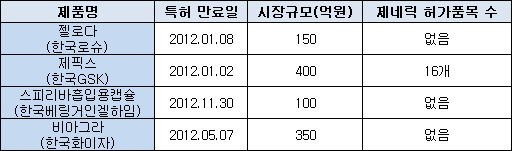 올해 가스모틴, 아타칸, 디오반, 싱귤레어 등 대형 블록버스트가 잇따라 특허만료된 것에 비하면 초라하다.