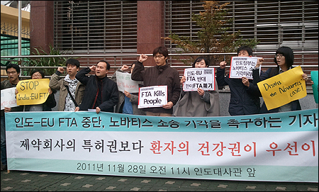 환자 및 시민단체들이 대규모 연합한 보건의료단체연합(보건연합)이 오는 29일 인도 대법원에서 있을 노바티스 특허권 보호 위헌 소송 최후변론에 맞춰 28일 오전 11시 서울 한남동 인도 대사관 앞에서 기자회견을 열었다.