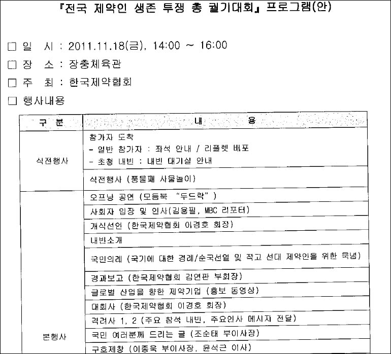 궐기대회 행사도 다양한 프로그램으로 준비했다. 우선 식전행사로 사물놀이 풍물패 공연이 있으며, 글로벌 산업을 향한 제약기업 홍보 동영상에 이어 조순태 녹십자 사장이 ‘국민여러분께 드리는 글’을 낭독한다.
