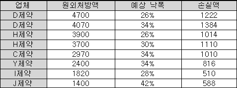 처방액 4700억 규모의 D제약의 경우 26%가 깎여 약 1200억원대의 피해가 예상되며, 3900억원대의 H제약도 동일한 낙폭으로 1000억원대 손해를 입는 것으로 분석됐다.