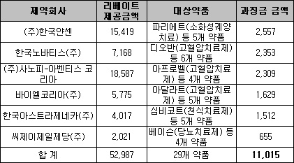 한국얀센은 154억원의 리베이트를 제공해 25억5700만원의 과징금을 부과받았다. 또한 한국노바티스는 리베이트 제공금액으로 71억원을 사용, 23억5300만원의 과징금을 물게 됐다.