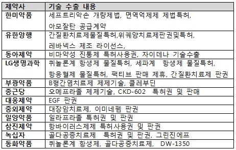 기술 수출 계약을 따낸 상당수 제약사들은 신약 개발 과정에서 얻어진 기술이나 특허를 해외로 수출했다.