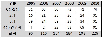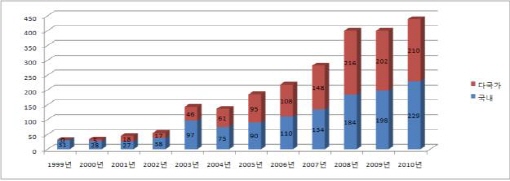 2008년 184건, 2009년 198건이던 임상 건수는 2010년 229건으로 다국가 임상을 넘어섰다.