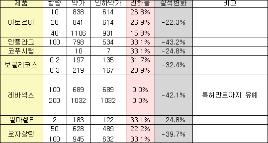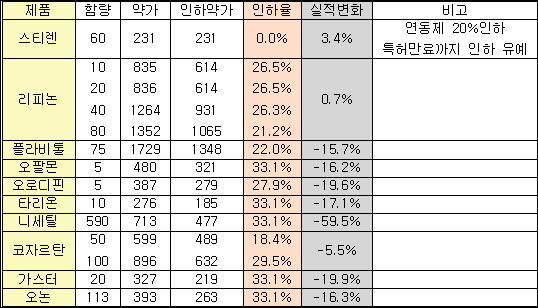 또한 이번 품목 분석의 경우 기등재약목록정비에 따른 약가인하 분은 반영하지 않았다는 점에서 제약사 주력품목들의 실제적인 낙폭은 더 클 것으로 관측된다.
