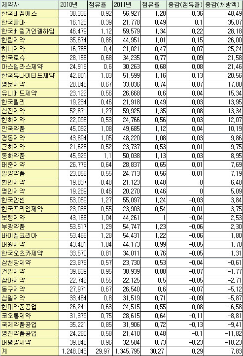 베링거인겔하임, 한림제약, 하나제약, 한국로슈 등도 20%대의 높은 성장률을 기록했다.
