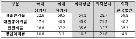 권 이사는 또 "국내제약사 매출 원가율은 52.6%로 제조업 81.9%보다 낮은 수준이지만 외국계 제약사 본사 28.7%의 두 배 수준"이라고 말했다.