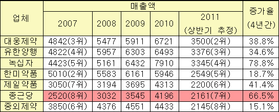 종근당은 2007년 6위권에 포진하며 전통적인 상위제약사로 자리매김해 해왔던 중외제약을 올 상반기 처음으로 매출액 부문에서 앞지르기도 했다.
