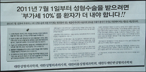 성형외과 의사들이 일간지 광고를 통해 7월부터 도입되는 성형수술 부과세에 부과에 강하게 반발하고 나섰다.