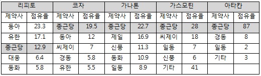 - 코자·가나톤·가스모틴·아타칸 제네릭 점유율 1위 기록