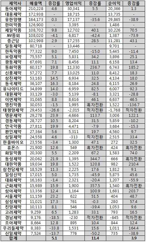 반면 유한양행, JW중외제약, 한독약품, 일성신약 등은 이익이 큰 폭으로 감소했으며, 삼일제약과 태평양제약은 적자 전환했다.