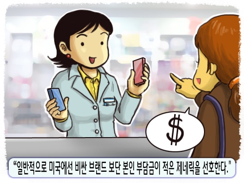 미국에 갓 왔을 무렵 병원에서 안과용 항생제를 처방받은 적이 있다. 의사는 브랜드네임을 처방전에 썼는데 약을 받아보니 제네릭이었고 코페이가 5불 정도였던 것 같다. 미국 건강보험체계를 모르고 제네릭에 대한 한국식 선입견을 가지고 있었기 때문에 브랜드를 원한다고 하니깐 약국에서 이해할 수 없다는 표정을 하면서 브랜드를 조제해준 기억이 난다. 그 당시 브랜드로 교체하면서 내가 낸 돈은 거의 50불이었다. 지금 생각하면 의사는 브랜드 네임을 처방전에 썼고 관행대로 DAW (dispense as written)을 지시하지 않았기 때문에 약국은 당연히 제네릭을 내보냈고 건강보험회사는 제네릭에 대해 1st tier 수준의 코페이를 설정했는데 나의 몰지각으로 5불에 사도 될 약을 쓸데없이 50불에 산 셈이다.