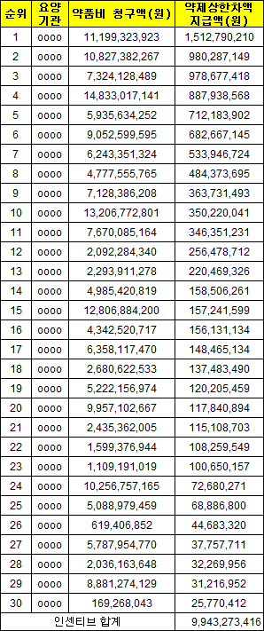 결과적으로 A병원 한 곳이 10만원 미만인 하위 3398개 기관보다 33배나 더 많은 인센티브를 받았다는 계산이 나온다.