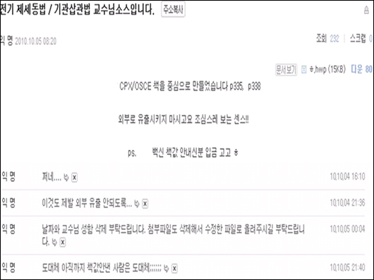 댓글에서는 '제발 외부에 유출 안되도록', '날짜와 교수님 성함 삭제 부탁드립니다' 등이 올라왔다.