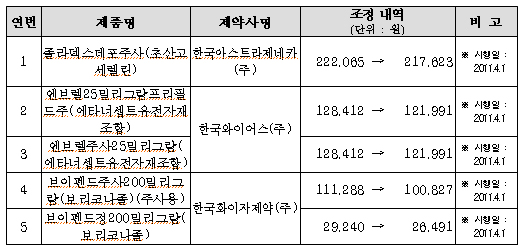 엔브렐주사 등 5개 품목은 보험급여 기준이 확대되면서 자진인하 형식을 빌어 마찬가지로 약가가 하향 조정된다. 시행일은 4월1일부터다.