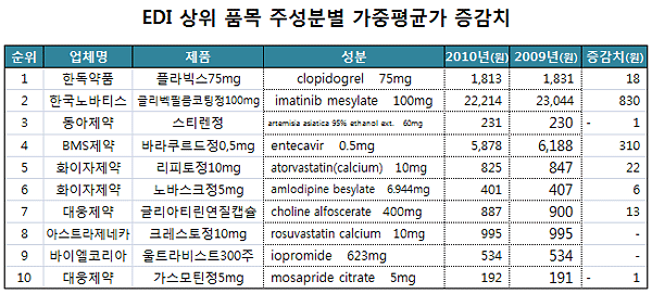 데일리팜이 11일 건강보험심사평가원에서 공개한 '2010년도 연간 의약품 주성분별 가중평균가격'을 바탕으로 EDI 10대 상위 품목 주성분별 가중평균가 증감치를 분석한 결과 이 같이 나타났다.