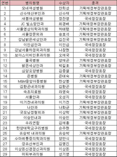 기획재정부장관 표창을 수상자를 보면 ▲모네여성병원 안희성 ▲신수재산부인과 신수재 ▲JC빛소망안과 최경배 ▲서울영상의학과의원 허태행 ▲서울장문외과 송호석 ▲강남밝은세상안과 김진국 ▲율곡병원 양재곤 ▲밝은세상안과 박길호 ▲은병원 은대숙 ▲M&M중앙아동병원 한상봉 ▲이기천내과 이기천 ▲나안과 나화균 ▲굿모닝정형외과 이상학 ▲이승민내과 이승민 ▲유승박내과 유승박 등 15명 이다.