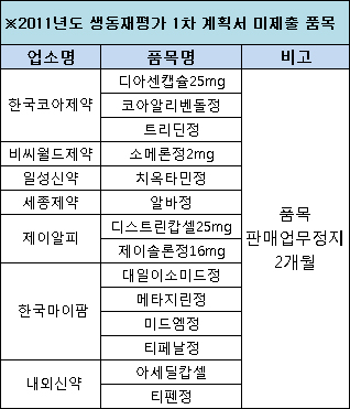 이들 업소는 2011년도 생동재평가 대상이었지만, 마감시한인 지난해 11월까지 계획서를 내지 못했다.