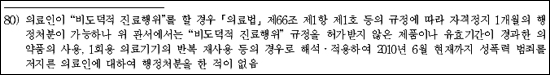 의료인이 '비도덕적 진료행위'를 할 경우 의료법에 따라 자격정지 1개월의 행정처분이 가능하지만, 복지부는 이 규정 적용대상을 허가받지 않은 제품이나 유효기간이 경과한 의약품 사용, 일회용 의료기기 반복 재사용 등으로 한정해 2010년 6월까지 단 한번도 처분하지 않았다는 것이다.