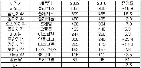 또 급여 기준 변경에 따라 수혜가 예상됐던 아스피린 계열 약품도 증가폭은 기대보다 미미한 성장에 그쳤다.
