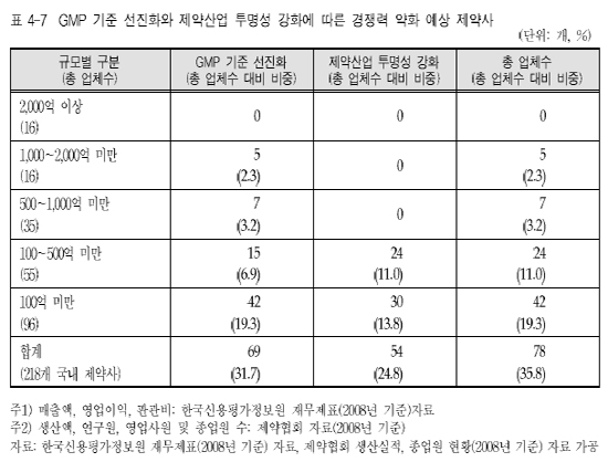 3일 연구보고서에 따르면 GMP 기준 선진화와 제약산업 투명성 강화에 따라 경쟁력이 약화될 것으로 예상되는 제약사는 완제의약품 생산업체 218곳(2008년 기준) 중 78곳(중복고려)이다.