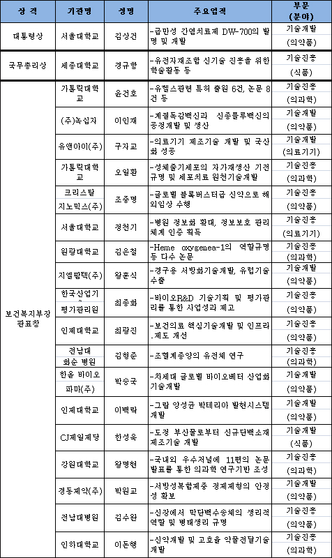 또 유헬스 특허를 다수 보유한 가톨릭의대 윤건호 교수, 국내 백신공정을 개발한 녹십자 이인재 상무 등 의료계와 제약계 종사자 18명이 복지부장관표창을 받는다.