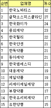 한국얀센, 한독약품, 동아제약, 한국엠에스디는 21품목으로 그 뒤를 이었다.