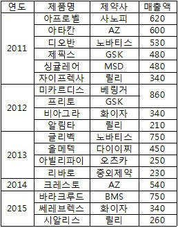 특히, 2015년 기준으로 한국노바티스, GSK, 아스트라제네카 등의 특허 만료품목 매출액이 컸다.