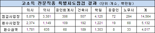 점검은 2008년 하반기부터 올해 상반기까지 의료기관과 약국, 공인회계사, 건축사, 학원 등 1만4564개 사업장을 대상으로 실시됐다.