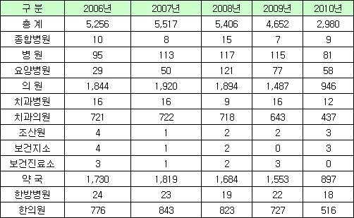 한편 연간 4000 곳 이상의 요양기관이 폐업하고 있는 것으로 이번 조사에서 밝혀졌다. 2010년 한해동안 약국은 897곳이, 의원은 946곳, 병원은 81곳이 문을 닫았다.