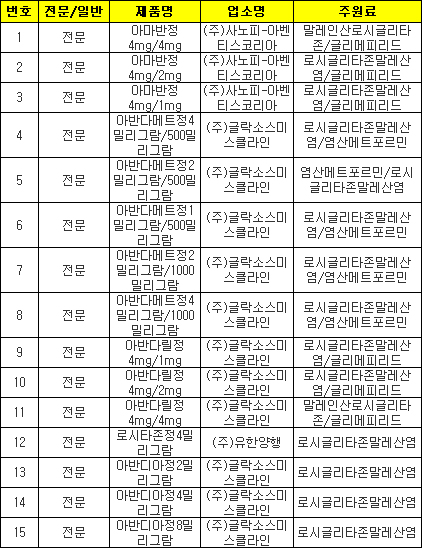 식약청은 24일 당뇨병치료제인 로시글리타존 성분 함유제제 아반디아 등 15개 품목에 대해 원칙적으로 처방·조제 등 사용을 중지시키고 이를 건강보험심사평가원에 통보했다고 밝혔다.