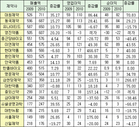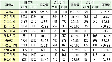 다만 LG생명과학, 한미약품 등 일부상위제약사와 신일제약, 영진약품 등 중소제약사들의 영업이익과 순이익은 큰폭으로 줄어 수익성에 빨간불이 커졌다.