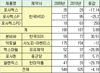 데일리팜이 의약품 조사기관 유비스트 자료를 토대로 '골다공증 치료제 8개 주요 품목의 2010년 상반기 원외처방 실적'을 분석한 결과, 8개 제품 평균 증감율은 -4.19%로 나타났다.