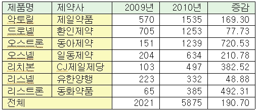 제품별로는 제일약품의 악토릴이 169.3%(5억7000만원 → 15억3500만원)의 높은 성장률을 보이며 두각을 보였고, 그 뒤를 환제약의 드로넬과 동아제약의 오스트론이 바짝 뒤쫓고 있다. 드로넬은 77.73%(7억500만원 → 12억5300만원), 오스트론은 720.53%(1억5100만원 → 12억3900만원) 성장했다.