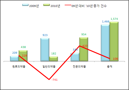 반대로 2008년 하반기 이후 감소했던 전문의약품은 2010년 상반기에는 954건으로 지난해 같은 시기(334건) 대비 286%로 예전 수준을 회복했다.